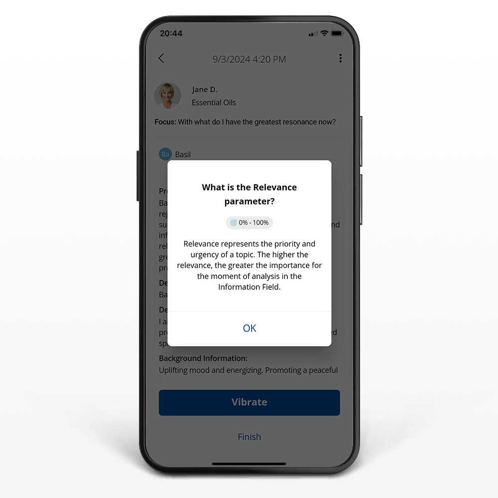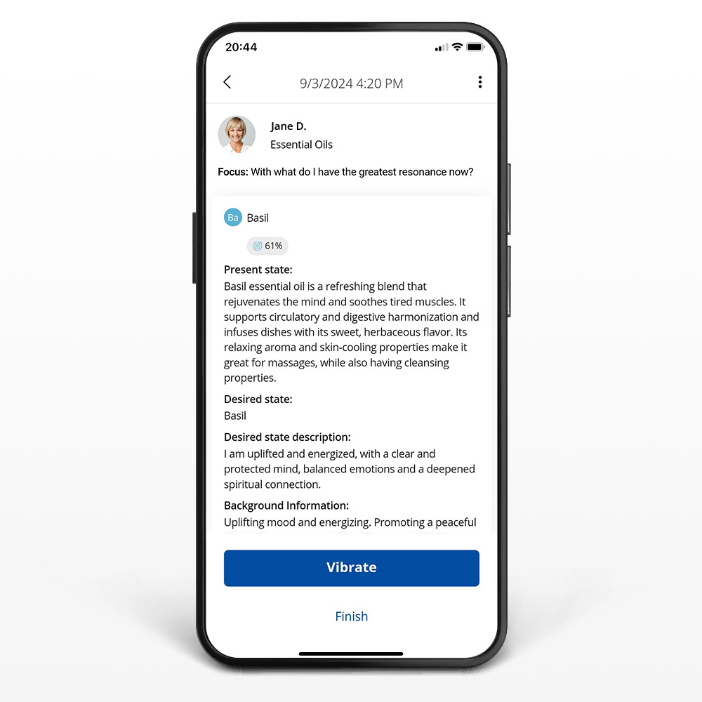 यह मॉड्यूल एसेंशियल तेलों के प्राचीन ज्ञान को अत्याधुनिक तकनीक के साथ इंटीग्रेट करता है, जो 101 अलग-अलग एसेंशियल तेलों के अनोखे सूचना पैटर्न तक पहुंच प्रदान करता है।