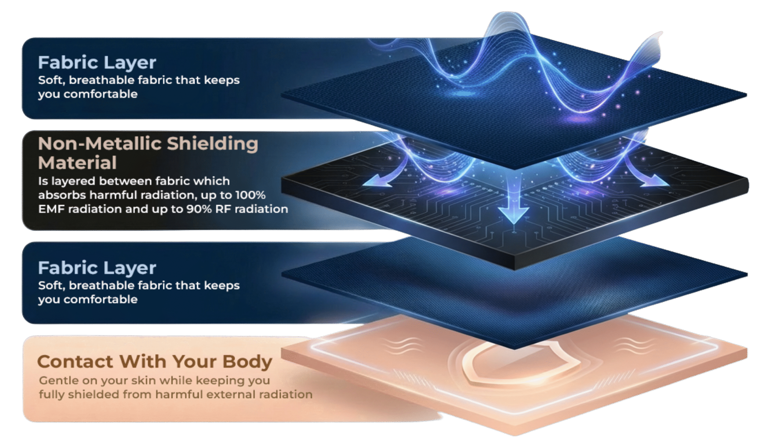 हर प्रोडक्ट में खास गैर-धातु शील्डिंग फ़ैब्रिक इस्तेमाल किया गया है, जो आपके रोज़मर्रा के जीवन में बाधा डाले बिना काम करता रहता है।