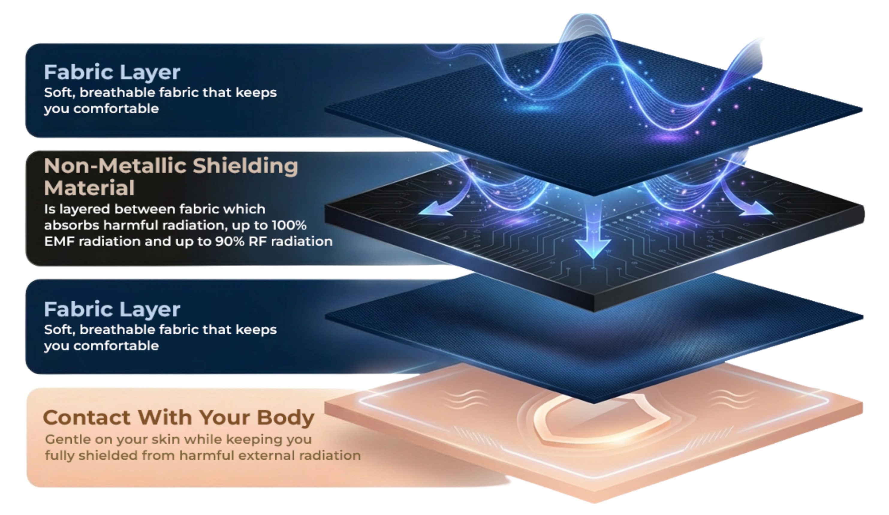 हर प्रोडक्ट में खास गैर-धातु शील्डिंग फ़ैब्रिक इस्तेमाल किया गया है, जो आपके रोज़मर्रा के जीवन में बाधा डाले बिना काम करता रहता है।